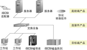 iSCSI产品从功能上可以分为3个类别:起始端产品、连接件产品和目标端产品(如附图所示)。