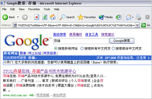 存储在线消息 2003年6月11日,存储在线(STOL.com.cn)近日在全球知名的搜索引擎Google.com的“存储”和“硬盘”两个关键字查询结果中名列第一。