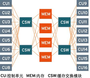 为了提高存储性能,2000年HDS推出采用交换式架构的HDS 9900系列,即第一代的Hi-Star交换技术。HDS是高端存储领域中惟一使用这种架构的厂商,当时的代表作是9910和9960两款产品。这种新架构的技术提供“点对点”、“无阻塞”的数据访问,其中9960使用64位RISC CPU,在满配置情况下其内部连接提供高达6.4GB/s的带宽,其中3.2GB/s用来传输数据,另3.2GB/s传输内部控制信息。如图1所示,在交换式架构中,最重要的部件是CSW(Cache SWitch,缓存交换模块)。通过CSW交换,提供8条到处理器端的通道及4条到缓存模块的路径。在9960中共有4个CSW,从而共提供到处理器端的32条路径及到缓存模块的16条通道。从处理器到CSW交换模块的每条总线频率为100MHz,数据位宽16bit(即2个Byte),因此每条通道的数据传输速率达到200MB/s,32条通道共提供6.4GB/s的数据传输带宽,而数据传输即CSW到缓存模块的带宽为3.2GB/s。另外,CSW还可以提供路径仲裁功能,保证数据传输没有障碍。