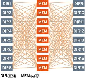 DMA架构的核心是通用缓存控制器(Global Cache Director),采用多功能的、可靠的内存技术,实现矩阵式的传输通道,并通过传输通道仲裁以优化在前端通道控制器和后端磁盘控制器间的数据传输速度,尤其在大负载和多突发负载情况下性能更为突出。DMA架构最多支持8个通用缓存控制器,而每个控制器负责控制4个独立的缓存模块,8个通用缓存控制器可以同时、并行地访问到所有32个相互独立的缓存模块。每条通道的传输速率为500MB/s,因此DMA架构中缓存间带宽为16GB/s。
