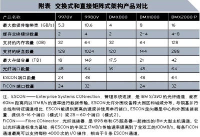 正是由于交换式架构的成功,HDS在高端存储上蚕食着EMC的份额。甚至有报导指出,在2002年第四季度,HDS一度超过了仍采用共享总线式架构的EMC。我们在上文已经提到,EMC在三年前就认为传统的共享总线式架构会在不久的将来产生传输带宽的瓶颈。下面我们就来看看这3年来EMC的成就。