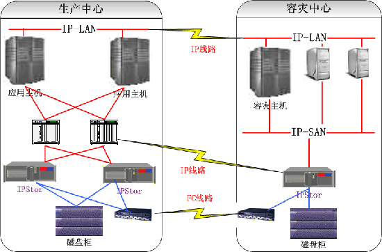此次实施的远程数据容灾方案以美国飞康 (Falconstor)公司IPStor软件为存储架构,建立一个广义的SAN的存储中心,它的整个架构是建立在IP的基础之上。存储是通过IPStor 服务器TCP/IP 网络输出到前台应用服务器的。