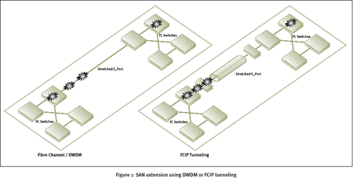 图一:通过DWDM或FCIP隧道进行的SAN拓展