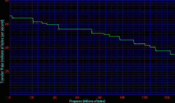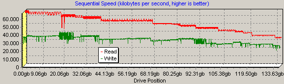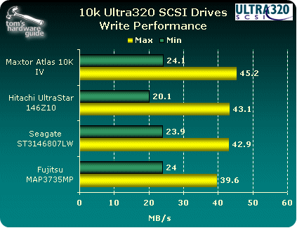 然而有些测试显示,慢工出细活的146Z10并不是没有优点。我们很惊讶的发现,它的写入性能持续性的稳定,最大性能甚至夺魁,超越Seagate与富士通。但它的最低写入效率就表现平常,约在每秒20 MB。