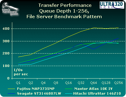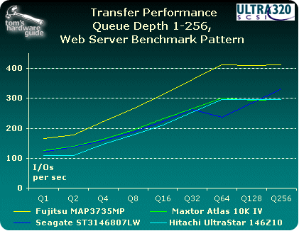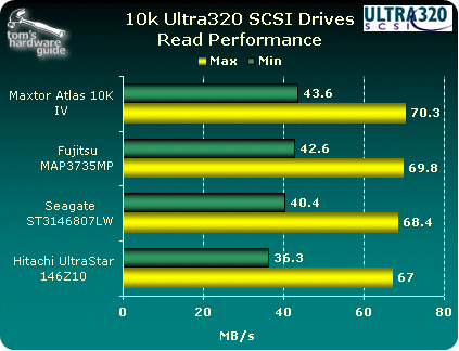 如果把硬盘的工作环境加入考虑,那这些测试数据就不是那么有意义了。举例来说,有着6个碟片的日立硬盘,其工作温度一直保持在50°C以下;而其它硬盘则较热。这表示日立146Z10在大热天、或是冷房效果不佳的机房,也能运作自如。