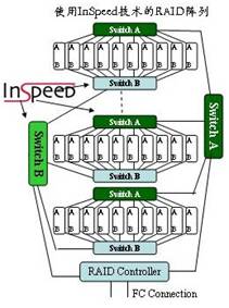 传统的模块化阵列内部采用双FC-AL环路,由于所有的硬盘都在一个环路上,当硬盘数目很多时,造成很大的读写延时,降低了性能。右图是采用InSpeedTM技术对阵列的连接部件进行改造的一种可能配置。在这个配置中,从RAID控制卡到硬盘之间采用了全交换的技术,极大地提高了磁盘阵列的性能。可以预料随着InSpeedTM技术在模块化存储系统中应用的不断普及,必将会加剧这类产品对高端存储阵列产品的挑战,使用户以优惠的价格获得高性能的产品。