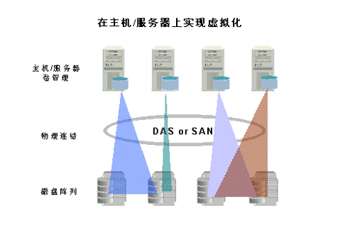 如果仅仅需要单个主机服务器(或单个集群)访问多个磁盘阵列,就可以使用基于主机的存储虚拟化技术。此时虚拟化的工作通过特定的软件在主机服务器上完成,而经过虚拟化的存储空间可以跨越多个异构的磁盘阵列。如下图所示: