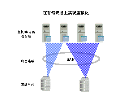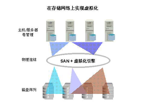 而以上描述的两种虚拟化方法的优点都可以在存储网络虚拟化上同时体现,它支持数据中心级的存储管理以及异构的主机系统和存储系统。