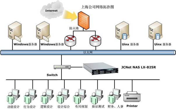 “你说得没错,我打听了一下,如果要在60个客户端实现上述的应用,价格比较高,而且部署管理起来及其不方便。有其他更简便更经济的方案吗?”王先生拿起桌子上的笔,绘制了该集成电话设计公司的网络拓扑图,边画边讲解:“这个是你公司现有的网络环境,基于贵公司的应用需求我建议采用网络附加存储方案。无须更改你现在的网络,只要在交换机端添置一台捷洲资讯的NAS设备,上面提到的问题都能得到解决,以后你就可以高枕无忧!”