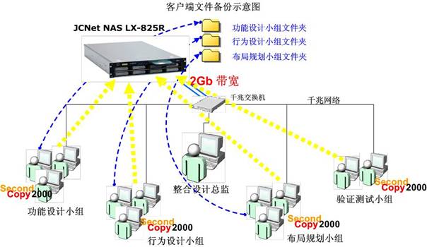 “如上图所示,通过捷洲资讯NAS LX-825R,每个客户端的文件可以备份到NAS上相应的文件夹里面。运用NAS LX-825R功能强大的客户端备份软件Second Copy 2000,可以轻松实现客户端日常文件的备份需求。客户端可以根据文件夹的属性与使用频率,在NAS上设立专门的文件夹,将PC上需要备份的文件夹与之建立连接,设置备份的时间点,就可以将PC端的文件备份到NAS上。同样,如果PC端的文件夹遭到损坏,NAS上的文件夹备份可以恢复到PC端。同时,还可以在NAS上针对不同的文件夹设立各种的权限,从而使得文件的共享与读写更加安全。”王先生对备份示意图进行了讲解。