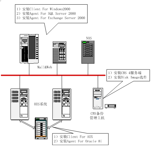 本案中采用了深圳市思创科达技术有限公司的Coinstor Backup Server 4备份软件及其相关选件。包括Oracle 8i 选件、Sql Server选件、Exchange Server邮件选件。CBS提供的无人值守的自动备份、跨平台数据管理、远程数据传输、打开文件备份、数据库管理、灾难恢复及等功能使整个数据备份系统的安全性、可靠性和高效性得到更充分的体现。