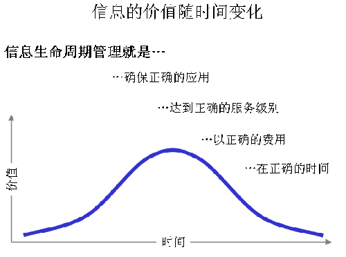 数据的价值通常会随着时间逐渐降低,因此所有数据在创建时都应当获得一个由数据的类型、数据的价值和相关法规的要求决定的删除日期。系统将定期清除到期的数据。除非对过期数据的创建进行正确的控制,否则对相关数据的搜索将会导致运营效率的不断降低。信息生命周期管理就是要根据应用的要求, 数据提供的时间及数据和信息服务的等级, 提供相适应的数据产生,存储,管理等条件, 以保障数据的及时供应。