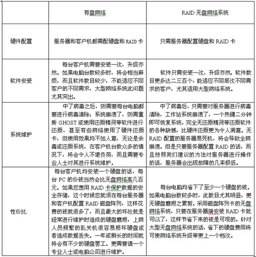 RAID的无盘网络就是采用一台具有磁盘阵列(RAID)服务器,所有的软件都安装在服务器上,而下面的工作组则无需光驱、软驱、硬盘。每台客户机只要配有一块网卡, 所有内容都从服务器上读取,共享服务器资源。