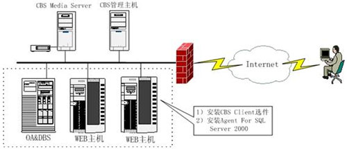 机房邮件和企业网站服务器通过CBS客户端可实现对所有的系统文件和其它应用文件正常备份,通过SQL Server代理可对SQL Server数据库作完整内部关联和在线的表级备份; 通过Exchange server代理可对邮件系统做个人邮箱备份、邮件文件系统、邮件数据库的在线和离线备份。
