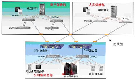 现在中国太平洋保险在存储系统中使用了光纤交换机和光纤路由器,SAN环境十分复杂,在备份方面有着许多需求。首先,中国太平洋保险要求集中备份,将多部门的多种不同平台的数据集中备份到一个磁带库中。其次,因为涉及的应用系统众多,要求备份系统的可靠性很高,能够保障全面的数据应用。再次,随着业务的不断发展,新的业务数据陆续增加到现有的备份系统中,需要很好的设备扩容性。