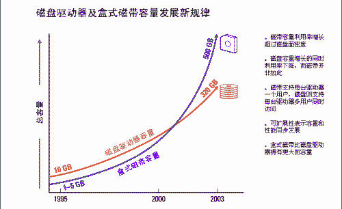 人们在1952年成功地推出了第一台磁带驱动器,并于1956年成功推出第一台磁盘驱动器,两者均来自IBM。40多年来,盘式磁带–及其后继产品盒式磁带–的容量一直小于磁盘驱动器。到了20世纪90年代后期,这种情形逐渐有所改变,因为磁带技术开始经历其历史上最重大的一次技术升级,盒式磁带容量的增长速度由此超过了磁盘驱动器。而因为自90年代初起磁盘录制密度就一直以每年60%的速度增长,所以磁带容量的提升具有特别重要的意义。