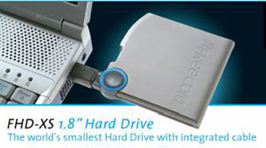 这款新产品的型号为FHD-XS,内置1.8英寸微硬盘,拥有20 GB和40 GB两种容量,支持USB 2.0高速传输接口,最高支持480Mbit/s传输速率,并向下兼容USB 1.1接口。FHD-XS非常小巧而易于携带,其体积仅为85 x 85 x 12毫米,比信用卡大不了多少,而重量也仅有150克。另外,这款产品抗震性能出色,在操作和非操作时,分别可以抵御300g和1000g的外部冲击力。