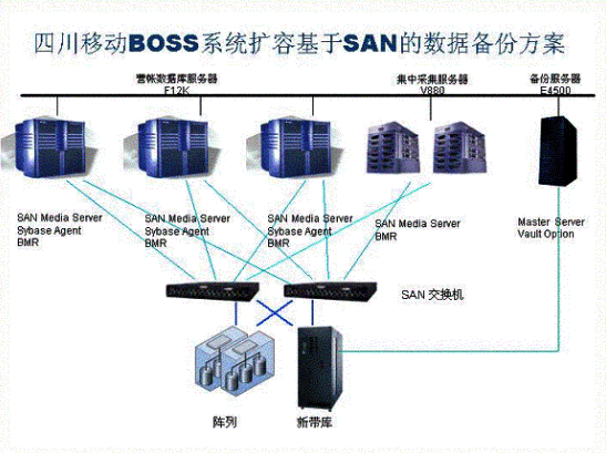 在BOSS系统中,在建立硬件数据存储体系时,选择了两种典型架构,一种是传统的以点对点连接为主的SCSI模式,针对于系统中的利旧设备,另外一种是利用光纤共享连接器形成的SAN模式,系统中所有的新增加设备均采用SAN模式,SCSI模式下的数据量为几十GB至几百GB,SAN模式下的数据量以8为单位,同时要求有更高的数据I/O效率,在系统的大部分服务器上运行Sybase数据库,要求能够进行实时的在线备份,针对这种需求,我们设计了如下的综合备份方案