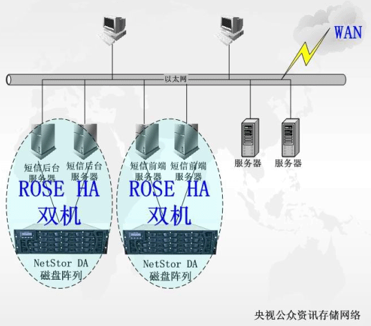 为满足用户需求,方案针对央视国际公众资讯短信互动系统,项目采用美国ROSE公司的ROSE HA高可用软件对双机系统进行管理,通过ROSE软件提供心跳线监控环境中的资源,包括物理卷、虚拟地址、虚拟主机别名、数据库应用等资源监控和切换工作。