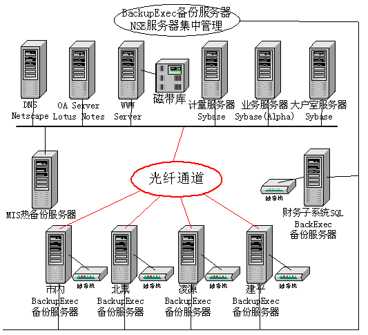 本项目涉及IBM、HP等服务器达30台,应用环境为局域、广域结合型架构,网络间通过2MB带宽进行连接。