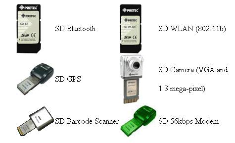 这次同期推出的还有Pretec最新推出的全系列SD接口的各种I/O设备,,其中包括了SD的蓝牙适配器,无线网卡,GPS接受器,摄像头,条码扫描仪以及调制解调器。