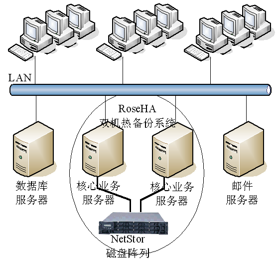 为满足用户需求,方案针对哈飞集团核心业务系统,项目采用美国ROSE公司的ROSE HA高可用软件对双机系统进行管理,通过ROSE软件提供心跳线监控环境中的资源,包括物理卷、虚拟地址、虚拟主机别名、数据库应用等资源监控和切换工作。
