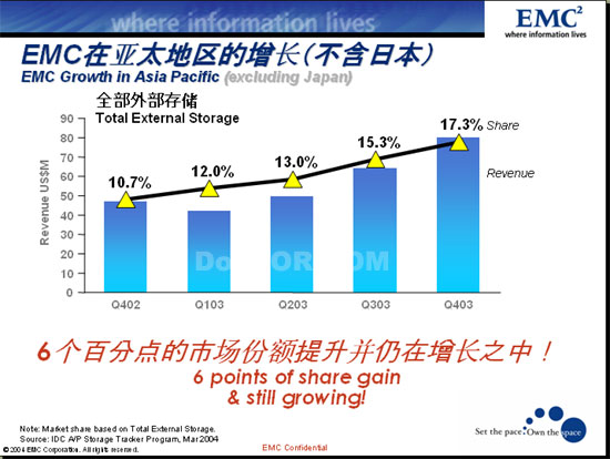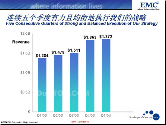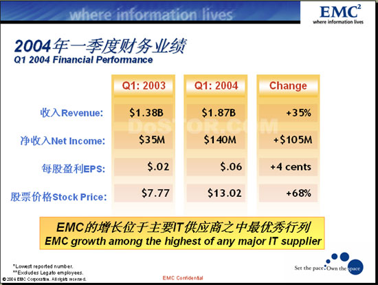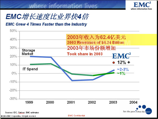 EMC是什么公司,我今天不提了,我们提供的硬件、软件服务,来帮助客户达到未来所要做到信息生命周期管理战略。首先很多数字给各位感觉一下。2004年我们第一季度的成绩,相比较于2003年第一个季度,我们有35%的增长,各位从一些数字,我不提太多,从股票,很多地方的数字可以知道EMC是我们真正的进入起步,而且是连续几年都是成长的阶段。