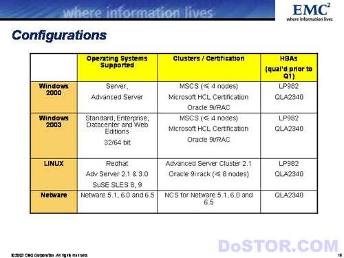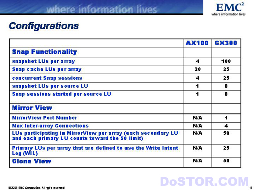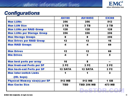 CLARiiON AX100 的主要特点是具有紧凑、高效的硬件设计,在一个 2U(3.5 英寸)可架装机箱中可安装多达 12 个串行 ATA (SATA) 驱动器。单个 AX100 阵列可提供 480 GB 到 3TB 的容量。CLARiiON AX100 通过SAN、NAS 或直接连接支持 Windows、Linux 和 NetWare 服务器平台。AX100 包括两种机型,它们设计为可支持您的应用程序需求、部署和可扩展性需要: