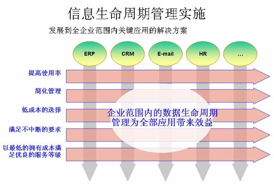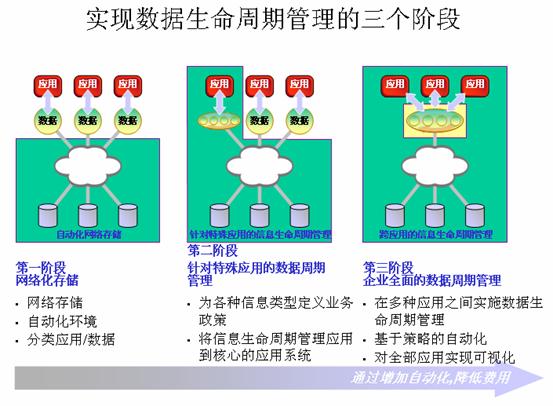 第一步是在企业广泛采用自动化网络存储,将企业信息的管理规范化、分层化。企业的数据存储系统得到充分的共享,数据和信息得到全面的保护。这是信息生命周期管理的基础。