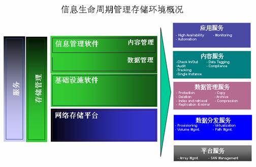 从信息存储的角度看,整个信息生命周期管理涉及信息存储的各项技术。包括网络存储平台、存储基础设施软件、信息复制,备份和恢复软件、基于策略的存储管理软件,以及存储和数据优化服务等。下面是对这些技术的基本要求: