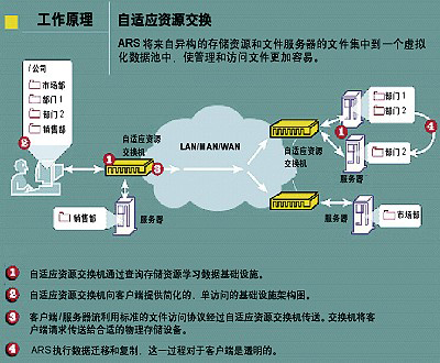 ARS将来自异构存储资源和文件服务器的文件集中到一个虚拟化数据池中,使管理这些文件更容易。这项技术使企业可提高存储资源利用率,方便地调节存储资源来满足不断变化的用户应用需求。
