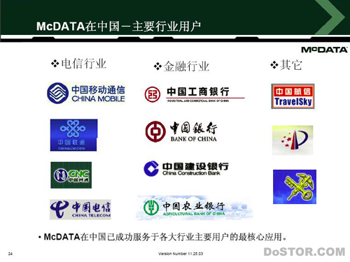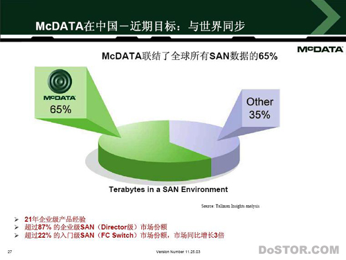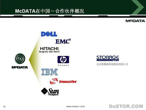 中国市场已经成为存储供应商们最重视的市场之一,McDATA更是如此。McDATA公司中国区总经理陈杰先生介绍了McDATA 2003年第四季度及2004年第一季度的市场,2004年第一季度业绩达到去年同期业绩的三倍。McDATA在中国区的发展策略目前是加强与最终用户的直接交流,加强与战略伙伴的密切合作,以解决方案为技术导向,加强团队建设。McDATA在中国目前已经发展了自己的分销商北京斯德锐公司,并正在选择自己的全国总代,并将在近期公布。据陈杰先生表示,McDATA分销商及总代都只将销售其中低端产品,其高端产品依然定位在OEM市场。