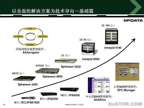 John Kelley先生此次来华,除了对去年底及今年初McDATA在国际及中国市场上的成绩做出回答外,在我们看来最重要的就是其11月将会发布的Intrepid 10000的介绍。据John Kelley先生介绍Intrepid 10000,是推出的第一款采用动态分区技术的智能交换机。该产品,可同时分解成四个独立的产品,并且可俺客户的需求随意分区,可以在不同分区运行不同的系统。John Kelley先生表示,Intrepid 10000拥有256端口,目前已知其支持FC及iSCSI模式。预计11月份同时在美国及亚太地区发布。