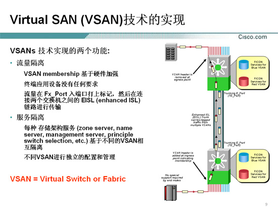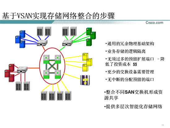 而在他们的演讲中,令我们印象颇深的是其所倡导的VSAN(存储网络虚拟化)技术。在基于虚拟化的统一存储网络部署中,利用多层智能化存储网络的VSAN技术,可以在一个单一的SAN结构中创建多个基于硬件的独立环境,从而提高SAN的使用效率。每个VSAN都可以作为一个常规的SAN进行单独分区,并拥有它自己的交换服务,从而提高可扩展性和恢复能力。VSAN不仅可以将SAN基础设施的成本分摊的更低,还可以确保数据传输的绝对隔离和安全,保持对各个VSAN的配置的独立控制。