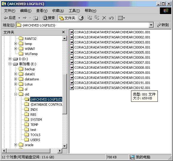 在E:old目录中会看到相关的数据文件都各存放在相对应的目录中,而文件名会变成如下图:所有文件都会以coracleoradataveritas为前缀的文件。