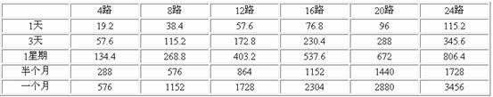 录像保存天数与硬盘的容量(每天24小时连续录像;硬盘容量单位为GB;下列数值的105%为硬盘实际使用容量)