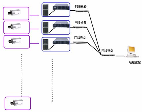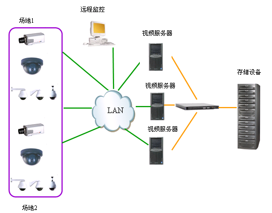 此类监控需求的特点是数据量大,视频线路广泛而相对集中,监控密度高、数据保存周期长,数据安全要求高。采用SAN连接方式让每台监控服务器或工控机直接接入倒SAN存储网络中,使用集中存储设备。这种方式一次性采购成本较高,便于扩展,长期维护成本低。