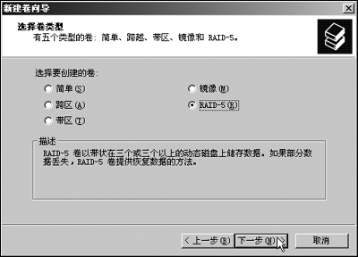第2步 单击“下一步”按钮,显示如图1所示“选择卷类型”对话框,选择欲创建的卷类型。通常情况下,为了保障数据的安全,应当选择采用RAID-1或RAID-5卷。本例选择“RAID-5卷”。