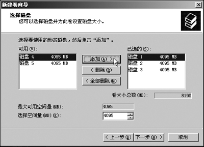 第3步 单击“下一步”按钮,显示如图2所示的“选择磁盘”对话框。在左侧“所有可用的动态磁盘”列表框中选择欲添加的磁盘,并单击“添加”按钮,即可将其添加至该RAID-5卷,并显示在“选定的动态磁盘”列表框。