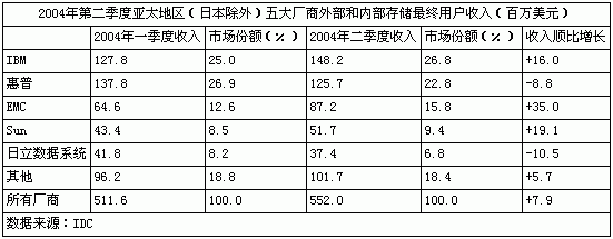 今年第二季度,IBM以26.0%的最终用户收入份额居亚太地区外部磁盘存储系统市场份额之首,EMC以20.7%的份额排第二位,惠普、Sun和日立存储系统份额分别为19.8%、9.3%和8.9%。