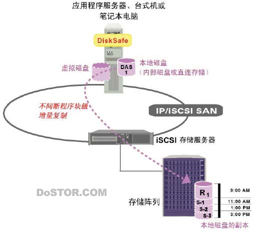 iSCSI 存储服务器通过其 DiskSafe 功能为包括直连存储在内的系统提供不间断的数据保护。DiskSafe 与能感知应用程序的飞康公司的快照代理集成,确保了副本数据是以一致、精确的交易状态复制并维护的,以便根据需要进行快速恢复。