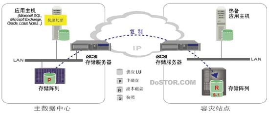 图 2. 用于灾难保护的 iSCSI 存储服务器复制配置的示例。快照代理确保了快速恢复的交易完整性和时间点一致性,可用于各种主流数据库、信息系统和文件系统。