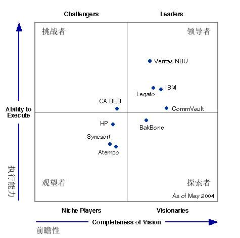 处在魔力象限中的任何公司都能潜在的在适当情形下提供最好的解决方案,但用户在评估企业级备份厂商时也强调执行能力,备份通常是与客户长期相伴的决定,此外,在成熟的市场里,客户不希望厂商位置发生戏剧性的变化,除非厂商真的发生了变化。