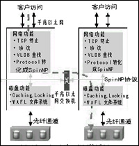 NetApp存储网格架构图显示,单一存储系统之间的互联互通,可以通过由Spinnaker公司开发的SpinNP协议来实现。通过该协议,数以千计的单一的存储系统之间都可以进行对话和数据的沟通。也就是说,通过该协议,能够实现全局命名空间功能,即无论用户的数据是什么类型,存储在什么位置,NetApp的存储网格系统在进行整合的时候都不会影响用户,用户只需知道最初的数据文件的名称,即可找到这个数据。