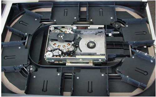 PowerVault 122T 包含八个盒带,围绕中央装载的磁带机按回转木马方式环形排列,并逐个依次插入磁带机。图2所示为采取该回转木马结构的PowerVault 122T 内部视图。