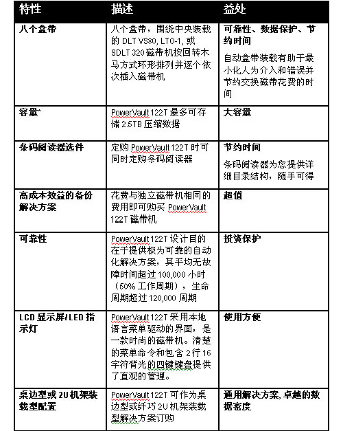 •PowerVault 122T 磁带自动装载机业已经过认证测试和验证,可运行于戴尔服务器,同时其获得戴尔技术服务支持。