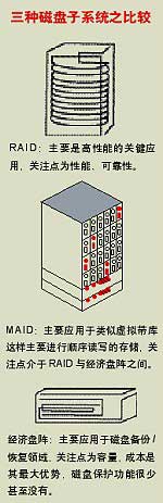 在磁盘子系统领域,原来主要有两种类型:高性能的RAID磁盘阵列以及经济型的磁盘阵列。最近在市场上将要出现一种新的磁盘子系统类型??MAID(Massive Arrays of Idle Disks)。MAID的大概意思是大规模非活动磁盘阵列存储。