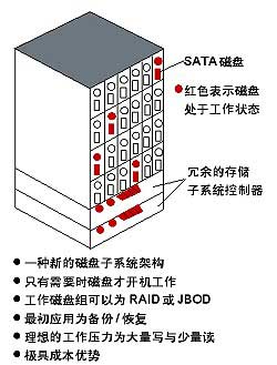 目前MAID还不能适用所有的应用,它最大的用武之地还是与数据保护有关的虚拟带库领域。大家都知道,自动磁带库属于近线设备,其性能无法与在线的高性能RAID磁盘子系统相匹配,因此用户可以在他们之间使用MAID作为缓冲,从而完成自动磁带库处理效率低下的存储需求。