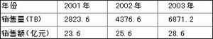从2001~2003年中国外部磁盘存储系统市场来看,销售额年复合增长率为17.8%,市场增长速度高于IT市场平均增长水平。作为计算机系统中保护数据安全的重要基础设备,存储系统产品和解决方案日益受到行业和企业用户的关注,存储系统已成为IT市场中一个新的亮点。随着中国电子政务、中小企业等领域信息化建设逐渐深入,2003年,中国外部磁盘存储系统市场总体上保持了较快的增长态势,市场销量为6871.2TB,市场销售额为28.6亿元。
