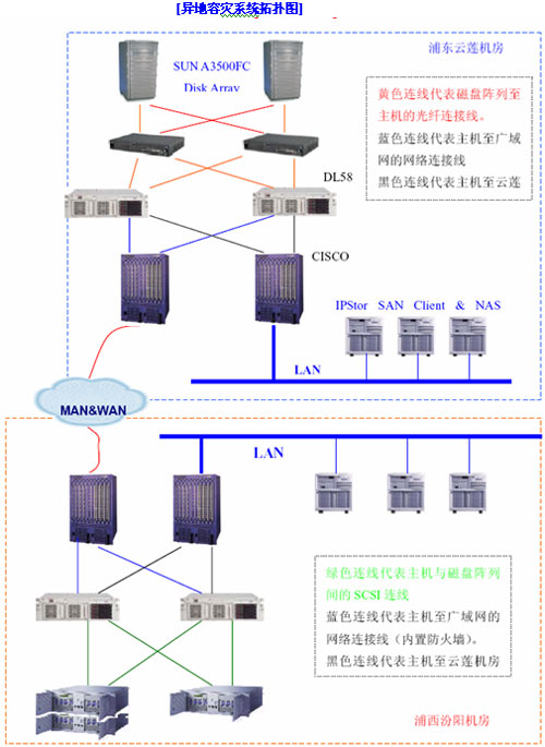 为了进一步完善IDC的业务系统,数据局提出了建立基于IP网络技术和远程光纤通道技术的存储区域网(SAN)和NAS的存储服务系统、数据备份服务系统和异地容灾系统。